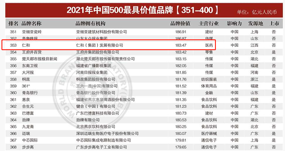 由世界品牌實驗室(World Brand Lab)主辦的(第十八屆)“世界品牌大會”于2021年6月22日在北京舉行,會上發布了2021年《中國500最具價值品牌》分析報告。“仁和”以183.47億元人民幣品牌價值位列榜單第353位,品牌價值較去年增長近30億元。這是仁和品牌連續十五年入選“中國500最具價值品牌”榜。