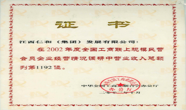 2002年度全國工商聯上規模民營會員企業經營情況調研中營業收入總額列第1192位 發布時間: 2019年12月18日 14:37:40 閱讀量: 8,988 上一篇:2004年國家工商行政管理總局守合同重信用企業
