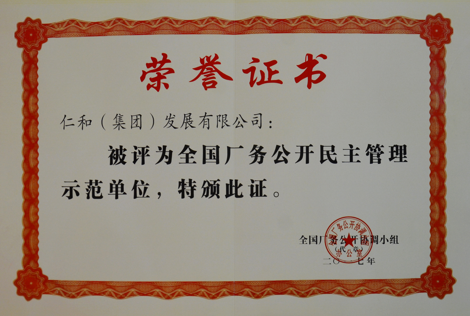 2017年全國廠務(wù)公開民主管理示范單位 榮譽證書 發(fā)布時間: 2019年12月18日 14:57:50 閱讀量: 9,489 下一篇:仁和集團榮膺“全國廠務(wù)公開民主管理示范單位”上一篇:集團榮獲2017年中國制藥工業(yè)百強